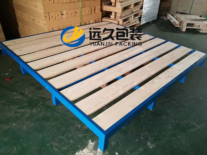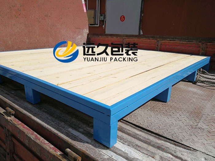 目前市场上使用的托盘从材料上看主要有木质托盘、塑料托盘、金属托盘、纸托盘、复合材料托盘。其中金属托盘承载能力在托盘中是非常强的,金属托盘的出现解决了重量大的物体运输中的安全问题。但是金属托盘成本费用有非常高,而且自重比较大是金属托盘一个无法改变的缺点。 钢结构托盘一般只是为了解决较重货物的承载问题才选用,如果对托盘强度要求非常高,而且又要一定程度上控制托盘的自重和成本,就需要通过改善结构设计来克服金属托盘自重大、成本高这一缺点。在这种市场需求客户需要的情形下,我司研发了一款金属钢制框架重型木托盘,很好的解决了既可以控制成本,又有高强度的托盘品种。 此款托盘是我司在2011年根据客户需求,为客户量身设计定做的一款载重能力超大的木托盘,最大载重量可达8000kg,金属钢制框架重型木托盘现在在市面上流通使用极少,在当时更是没有。此款金属钢制框架重型木托盘使用的是四向进叉结构,九个大脚用的是矩形钢,中层加上加厚的钢质横梁,四周的防撞梁焊接30的角钢,顶层用30mm厚度的加宽木板满铺,按照这个思路,很好的平衡了木托盘静载重量与动载重量,设计之初,客户对我们的思路十分满意,木托盘使用后的事实证明,效果非常的好,达到了客户预期需求。 金属钢制框架重型木托盘既解决了单纯的木质结构木托盘底部载重达不到所需要求,又很好克服了金属喷塑钢制铁托盘面板载重稍弱的情况,此款金属钢制框架重型木托盘的设计也为超重型托盘的设计提供了一个方向,可谓是开了一个金属钢制框架重型木托盘的先例。如果按它的材质归类,既可以归类为木托盘,也可以归类为铁托盘,结构是四向进叉结构,所以我司将其命名为金属钢制框架重型木托盘。