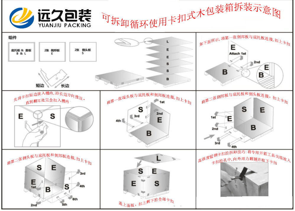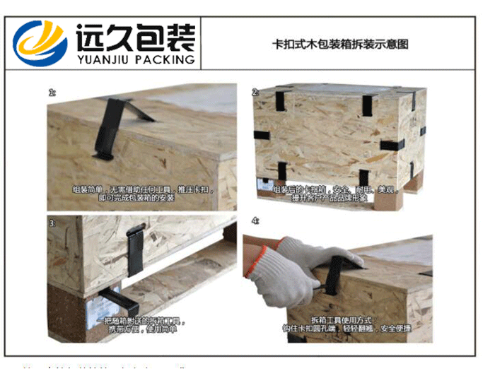 在拆卸、拼装、运输货物的过程中,金属件对胶合板的造成严重的破坏,金属件与板材的连接存在越来越大的空隙,箱板之间的连接不够紧密,木箱的使用寿命变短。卡扣木箱包装结构简单,快装易拆,它不同于栏式花格木箱每一个部件都需要采用铁钉连接,卡扣木箱的箱体只有六块,组装时只需将六块箱板用高强度锰钢连接件连接。